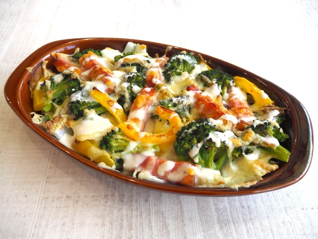 耐熱容器に①~③を並べ、ミックスチーズをかけ、オーブントースターで約10分焼く。