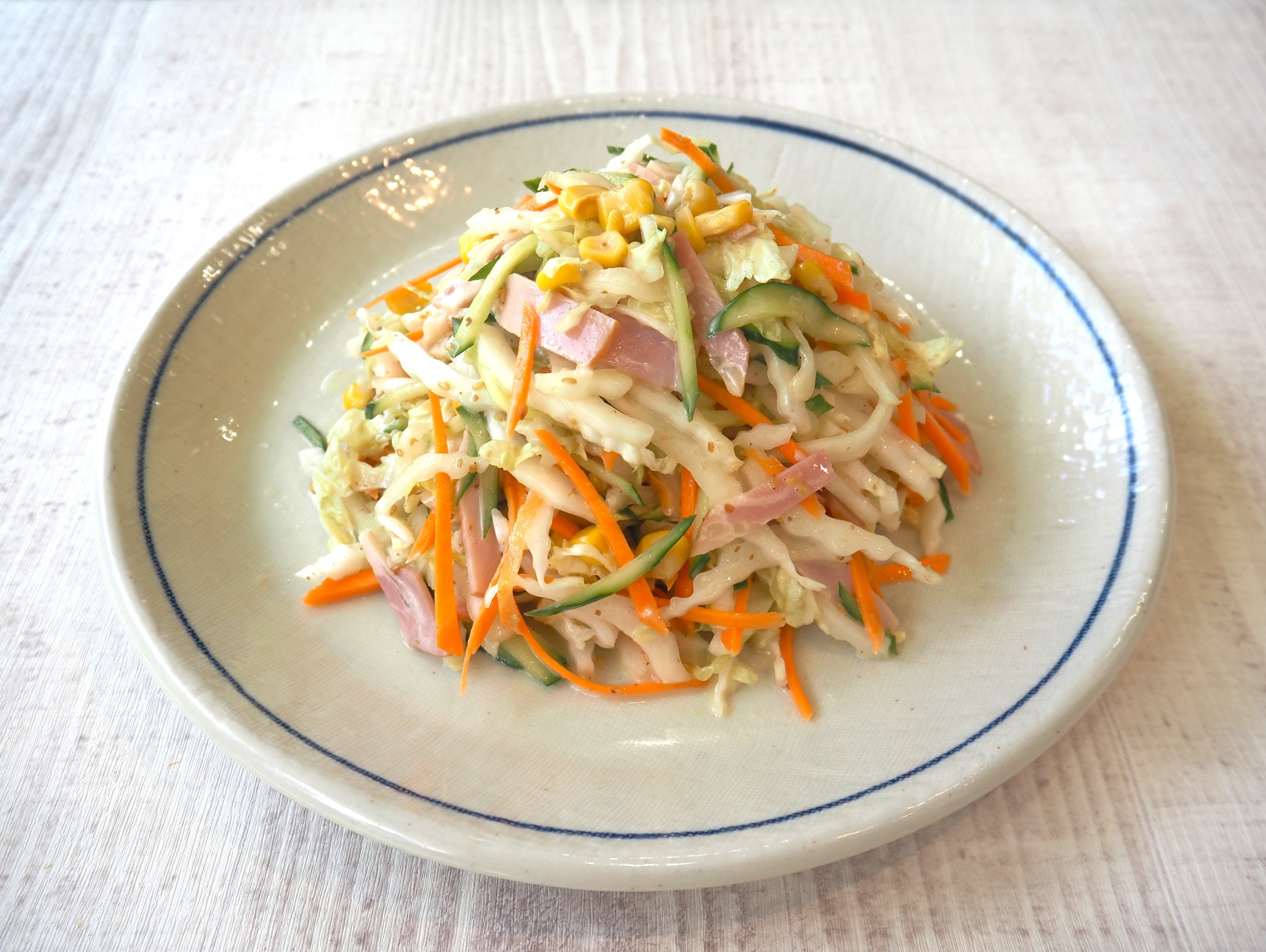 白菜を中心とした野菜を深煎りごまドレッシングで和えた、コールスロー風サラダです。