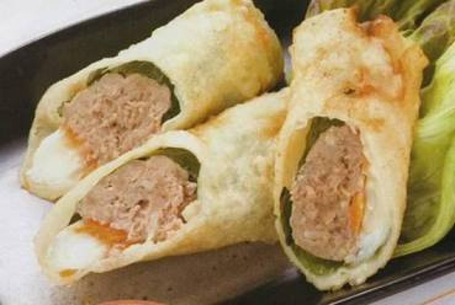 ねぎを広げ、人参のせんぎりを中心におき、ひき肉をのせ、青じそでふたをするように置き、春巻きの皮で巻く。