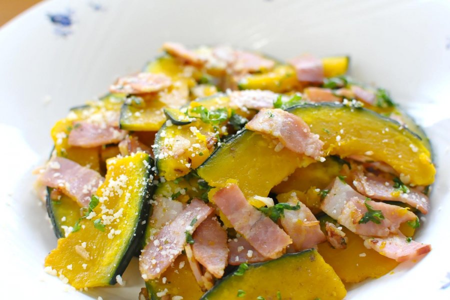 中華鍋かフライパンに油を入れて熱し、ニンニクを入れて炒めます。香りが出たらベーコン入れて炒め、かぼちゃを入れて旨みをからめながら炒めあわせ、塩・コショウで味をつけます。