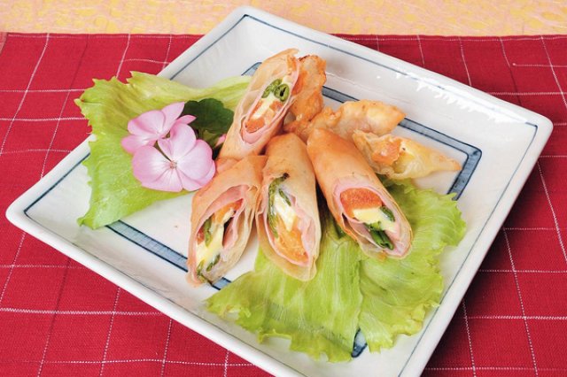 春巻きは、春巻きの皮の上にハムをおき、その上にカキ、インゲン、チーズを彩りよく並べ、春巻きを作る要領で皮を巻き、低温からゆっくり揚げる。