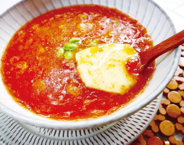 鍋に(b)を合わせて煮立てていく。トマトが柔らかくなってきたら水溶き片栗粉を入れとろみをつける。最後にごま油を回しかける。