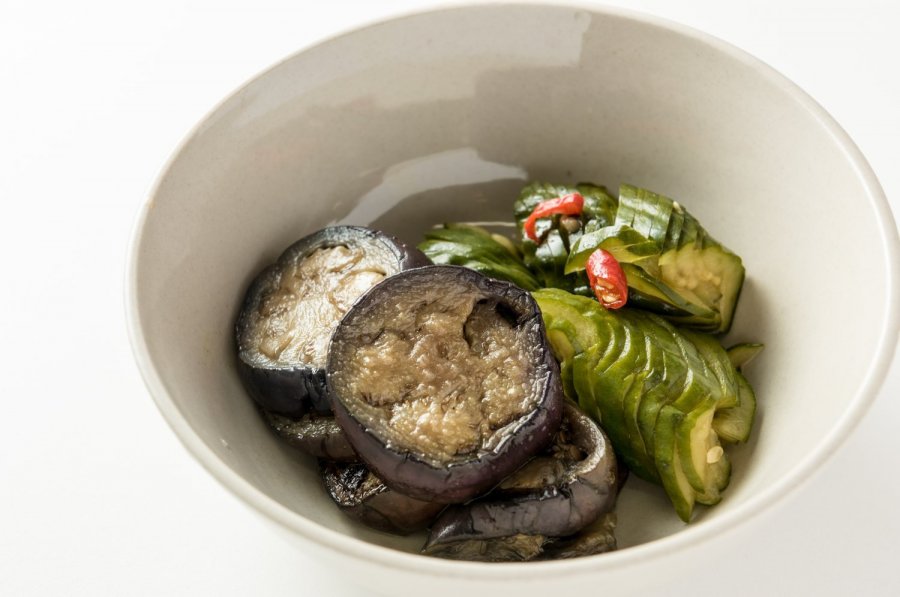 なすを1センチくらいの厚さで輪切りにする。胡瓜はまず厚みの3分の2まで細かい切り込みを入れる。裏返しにして厚さの半分まで斜めに切り込みを入れ、蛇腹切りにし1口大に切る。(乱切りでもよい)