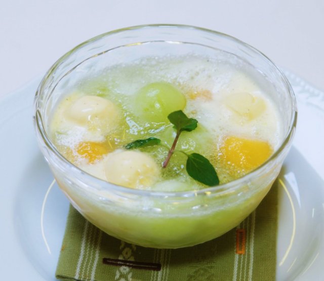 器に刻んだゼリーを入れ、くり抜いたメロン、メロンの氷、バニラアイスをのせる