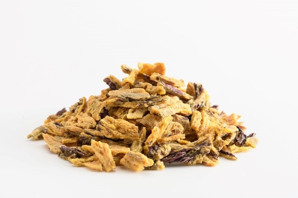 ほしいもピールと国産小麦粉を合わせた生地にブランデーやクルミなどを加えて焼き上げました。サツマイモの皮に含まれるクロロゲン酸やアントシニアンなどは、老化防止や視力改善に役立つと言われています。