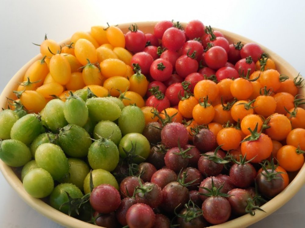 自社農場で栽培した5種類(色:赤、橙、黄、緑、紫)のミニトマトを原料に、弊社加工所で5色のジュースを1本1本手作りで製造しています。