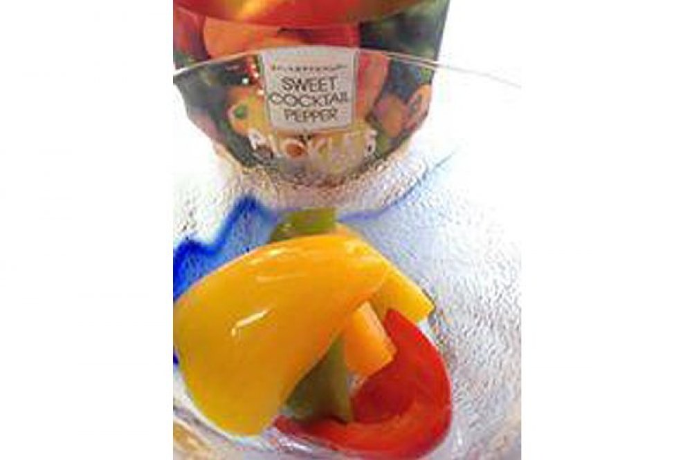 糖度10度以上のミニパプリカをピクルスにしました。商品名の「スイートカクテルペッパー」は商標登録を取得しています。  赤、黄、オレンジ3色のミニパプリカを使用しているカラフルなスイートピクルスです。