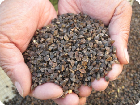 玄そばとは、結実し収穫されたままの殻つきのそばの実のことを指します。黒い殻(外皮)をかぶったままのそばの実のことで、「玄」とは「黒色」という意味です。