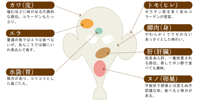 ゼラチン質で水分が多いあんこうは、「吊るし切り」という独特の方法で解体され、身・皮・胃・肝・卵巣・ エラ・ヒレなど、骨を除くほとんどの部位を食べることができます。これらは「七つ道具」と呼ばれ、淡白で柔らかい身や濃厚な味わい の肝、ゼラチン質の皮やヒレなど、それぞれ異なる歯ごたえや味わいが楽しめます。コラーゲンやビタミンなどを豊富に含み、体にもう れしい食材といえるでしょう。