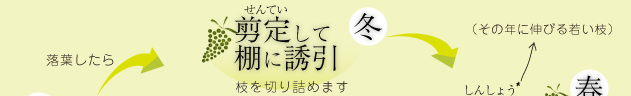 冬、剪定して棚に誘引。枝を切り詰めます。