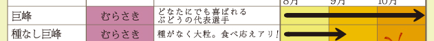 品種:巨峰 色:むらさき 特徴:どなたにでも喜ばれるぶどうの代表選手 時期:8月から11月