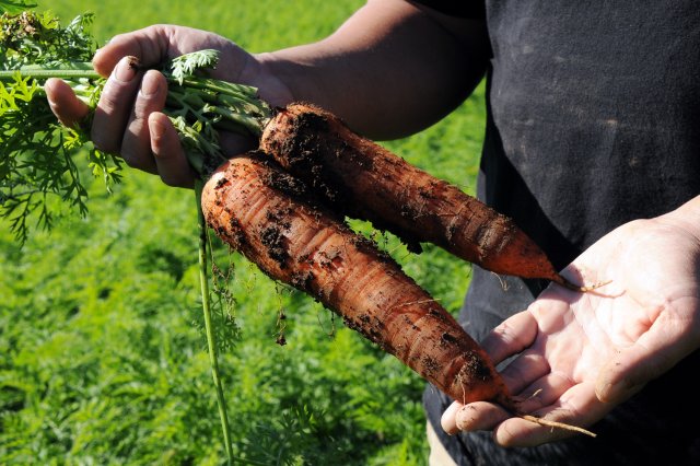 東郷ファームのにんじんを食べると、その甘さに驚きます。平均糖度は10度(オレンジと同程度)というその甘さの秘密は「土づくり」にあると東郷さん。 「『命は土づくり』です。作物は種を蒔いた瞬間からどんな形になるか、どんな味になるか、全てが決まると思っているので、その前に土に対して何ができるか、何をするかを常に考えています。 土づくりは大きく分けると緑肥、たい肥の2つです。収穫後の畑にソルゴーやライ麦などの緑肥を植えると、有機物を土壌に還元することになり、微生物を繁殖させてくれるので土壌バランスが整います。食物連鎖のバランスを土の中でとるイメージで、土の中の生態系のバランスがとれれば作物に病気はほとんど出なくなります。さらに、土の中に団粒構造ができるので、水はけや保肥力を高めてくれる効果もあり、土も柔らかくなります。 たい肥は、どこでどんな風に作られたたい肥なのかがとても重要です。“守谷酪農団地”の牛ふんたい肥は、温度70度で4週間きり返して作っているので余計な菌がいません。また友人の経営する乗馬場の、うちのにんじんも食べている馬ふんたい肥も使っています。この2つだけだとチッ素分が多いので、バランスを見ながら薬品を使わず3次発酵した大手卵メーカーの鶏ふんたい肥も入れています」