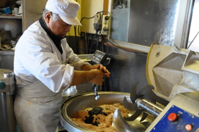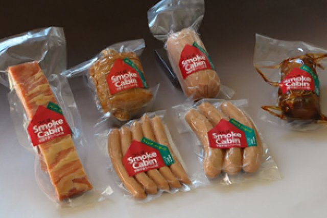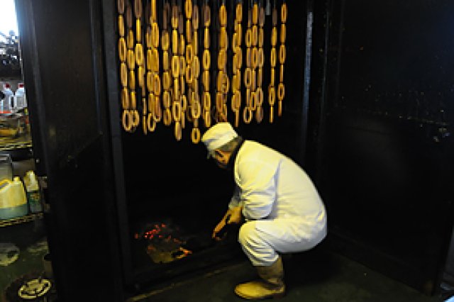 学園手造りハムの会の製品は、輸入冷凍肉を使わず、新鮮な生肉(茨城の銘柄豚ローズポーク)を使います。こだわりの原材料を元に、製造方法にもこだわり抜くのが『学園手造りハムの会』流。 直江さん「まずハム用、ソーセージ用、ベーコン用に仕分けた豚肉を、塩と砂糖に2~3週間にわたって漬け、十分熟成させます。塩漬けの時、細菌の抑制に"硝素"だけはどうしても必要なのですが、他の防腐剤、保存料は一切使用せず、異種蛋白による増量もしていません。漬けこみが終わると、ハムを未ざらしの木綿布でしっかり巻いて形を整え、ソーセージは天然の羊腸・豚腸につめます。この丁寧な手造り手法は日本では珍しいものです。」 最後に桜の薪を使い、約2~5時間(商品によって変わる)かけて低温でじっくりスモークして完成となります。ブランド名“スモークギャビン”の名の通り、香り高い『学園手造りハムの会』製品の秘訣はここにあります。