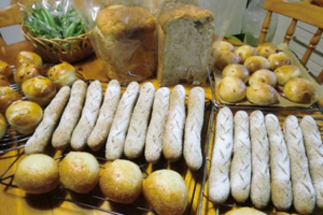 冬には冷たい海風が吹くひたちなか市周辺では、寒さから芋を守るため、芋のうねの間に麦を植える"麦間栽培"が昔から行われていました。現在この栽培方法をとる農家は少なくなりましたが、飛田さんはこのやり方を継承しています。 「麦間栽培は、寒さから芋を守ることができると同時に土が柔らかくなり、根がストレス無く伸びるため、芋がまっすぐ育ちやすいようです。また、麦わらを干して、ほしいもの干し場の足元に敷くと砂埃が舞うのを防いでくれます。麦の管理は大変だけど、収穫した麦でカミさんがパンやピザ焼いてくれるんです。いつかはこの麦でパン屋をやりたいっていうカミさんの夢のひとつが叶ったようで、嬉しいです。」 もちろんほしいもの為に栽培している麦ですが、現在3種類の麦を植えるなどして麦作りも楽しんでいると語る飛田さん。直売所の横にパン専用の加工所も造設し、できた小麦で奥様(裕子さん)が焼くパンは、時期限定ですが直売所で販売もされ、夏場はパン教室も開いているそうです。パンのおいしさを知っているリピーターも多く、パンの販売が開始されると即完売してしまうそうです。