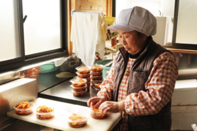 柴田早子さんは、笠間市で野菜を作り、それを加工品にして販売している農家です。加工品は主に、松前漬け、季節野菜の入ったおこわ、うりや大根の漬物。どれも優しいおかあさんの味が思い出されます。早子さんが作る加工品は、ご自身で作った野菜を自宅で加工したもの。 作っている野菜は人参、大根、白菜、キャベツ、ブロッコリー、ほうれん草など様々。もともと養豚を営んでいたご自宅の敷地にあった養豚場を壊し、畑を増やし、加工場を建てたそうです。 「主人と二人で加工品作りを始めました。養豚をやっていた頃から、いつかは作った野菜を加工品にして売りたいと主人が言っていたものですから。」野菜の種蒔き、肥料やりは早子さん、たい肥作り、収穫は旦那さんといった分業制で野菜を作り、加工品を作るのは早子さんの担当です。