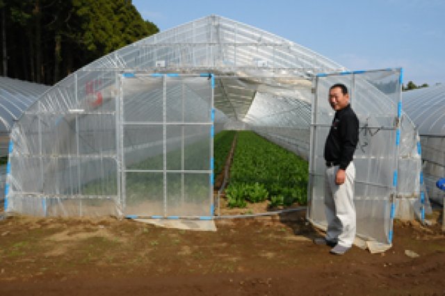 戦後からハウス栽培が盛んな鉾田市。鉾田舟木地区で、PGA.Bグループ(ピュアグリーンアグリ・ベーシック)代表を務める木村貴浩さんは、もともとメロンを作っていました。 毎年売上げ金額の目標を設定しそれをクリアして行くことで、良いものを作る楽しさ、売れる喜びを実感していたそうです。 しかし、大きな目標であった年間売上げ5千万円という金額をクリアした時、次の目標をどこに置くべきか考えたそうです。 「その当時私には2つの選択肢がありました。この売上げを多少前後しながらもキープしていくか、更にもっと上を目指すか。私の性格上、迷わず後者を選びました。しかし、もっと高い目標を目指すには、メロン作りではこれが限界だと感じたのです。」 木村さんは悩んだ末、メロンを作っていたハウスで、当時、国内において需要量が急増していたみず菜を作り始めました。ハウスを増やし、仲間を増やし、現在では9haもの広大な土地で、みず菜、ほうれんそう、小松菜、空心菜を栽培し、県内でも有数のハウス栽培農家へと躍進していきました。