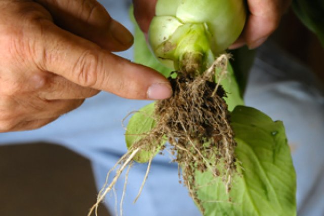 「農業の基本は、なんといっても土作りにつきます。チンゲンサイ作りは、土作りと、時期に合った品種選びをきちんと出来るかがとても大事ですね。」と菅谷さんは語ります。 菅谷さんのチンゲンサイ農場の片隅には、大きな"たい肥舎"があります。後継者である息子さんが建てたものだそうで、たい肥作りはその小屋で行われています。 「チンゲンサイが高値になったとき、一気にフル稼働できるように、良質な土を常に準備しておきます。チンゲンサイの値があまり芳しくない時は、とにかく土作りに徹する。ハウスの熱処理をしたり、たい肥作りをしたり。それが出来ていないと、いざという時に、根が病気になっていたり、安定した量を出荷出来なかったりするので、これだけは絶対に手は抜けません。」菅谷さんの作るチンゲンサイの根っこは、白く、多く、とても立派です。