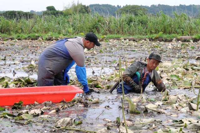 出頭さん 「実は『常陸国風土記(ひたちのくにふどき)(※)』に、『鹿嶋(鹿嶋市沼尾)のれんこんは身体に良い』という記述が残されていることを最近教えてもらいました。つまり、記録上では1300年以上前には鹿嶋市でれんこんが作られていた。けれど何かのきっかけで途絶えてしまったんです。茨城でれんこんといえば土浦市が最も規模が大きく生産が盛んなエリアですが、古くかられんこんにゆかりのある鹿嶋で再び作り始めたというプライドにかけて、鹿嶋のれんこんもおいしいということをPRしていきたいです。ぜひ食べてみてください」 小原さん 「出頭さんと同じ想いです。鹿嶋のれんこんを食べてもらいたい。僕はほとんど料理をしないということもあって、調理済みのれんこんがあったら手に取ってもらえる機会が増えるのではないかと思い、『蓮根肉餃子』や『レンコンキムチ』などの6次産業化商品も作っています。鹿嶋のれんこん、本当においしいので、ぜひ食べてみてください!」 「2人だと機械の買い分けができたり、作業の効率化を図れたり。2人だからこそできることが多い。1人ではできなかったと思う」と、言葉の節々から仲の良さが伝わってくる2人。今後の展望をお伺いすると、「2人とも想いは同じ。これからも助け合いながら納得のいくれんこんを作ること。そして1人でも多くの人に食べてもらいたいので、PR活動も積極的にやっていきたい」と熱く語ってくれました。 情報発信はそれぞれのInstagramで行っており、毎年10月に開催される「鹿嶋まつり」では、「れんこん詰め放題」や「蓮根肉餃子」の販売などもしているそうです。 県内最古?!のれんこんの産地で、千年の時を越えて再び動き出した2人の挑戦は、まだまだ続きます。 ※奈良時代初期(713年)に編纂された常陸国(現在の茨城県の大部分)の風土記