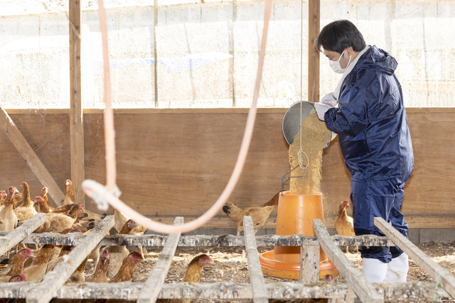 先代と異なる育成方法を取り入れながら、新しい奥久慈しゃもの美味しさを追求する敏治さん。常に鶏舎の外から鶏を見守ります。 「ストレス値が高くなると他の鶏をつつく鶏が現れてくるので、そんなサインを見逃さないようにしている」と言います。鶏の歩き方や行動がいつもと違っていないかと目を見張ります。 鶏たちに目を光らせる反面、敏治さんはなるべく鶏舎に入らず、鶏に余計なストレスを与えないようにするのも重要なポイントと考えているそう。「先代は鶏の世話を積極的にするために鶏舎によく入っていたんですが、僕は逆に鶏舎になるべく入らないように心がけています」と敏治さん。 また、育て方も工夫を重ねており、最近では他の生産者から刺激されてはじまったこととして、しゃもの不安を払拭するために、電球の位置を下げることで鶏舎内をより明るく照らしてあげるようにしたとも言います。 「まだまだ自分の中でコレだというしゃもを育てられてはいませんが、いつかは育ててみたいです」と語る敏治さん。今は生産組合が手厚いサポートをしてくれているので、安心して奥久慈しゃもの飼育に専念できているとも頷きます。 飼育日数が非常に長くかかる奥久慈しゃも。ミネラルたっぷりで高タンパク質・低脂質のこだわり抜いた餌と、なるべくストレスのかからない環境で、美味しい奥久慈しゃもを生産し続けていきたいと語ります。
