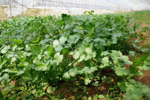 シャンサイは、国内ではまだ新しい作物のため、農薬のガイドラインがありません。つまり、現時点では農薬が使えない作物なのです。代わりに、たい肥を入れた入念な土作りを行い、除草は手作業で行います。また、栽培においては、「水の管理とビニールハウスの換気に非常に気を遣う」と言います。 「シャンサイはセリ科で、水分をとても必要とする作物です。かと言って、あげ過ぎも良くない。成長の段階と、それぞれの圃場に合わせた水の管理が難しいです。まず、9時~10時頃に(ハウスに)来て、土や、葉等ハウス内全体を見ます。朝早く見るのは夜露が残っているのでダメなんです。それで、水が必要か不要かの判断をします。換気は常に行っていますが、収穫の1週間~10日程は特に繊細な換気が必要です。それまで与えてきた水分を、この期間で換気して乾かすからです。水やりも換気も、とにかく“ハウスをこまめに見る”これが何より大事ですね。」 JAなめがたしおさいのシャンサイ担当者によると、いつシャンサイが水を必要としている状態なのかは、経験を積んだ生産者にしかわからず、これぞ『匠の為せる技』なのだそうです。