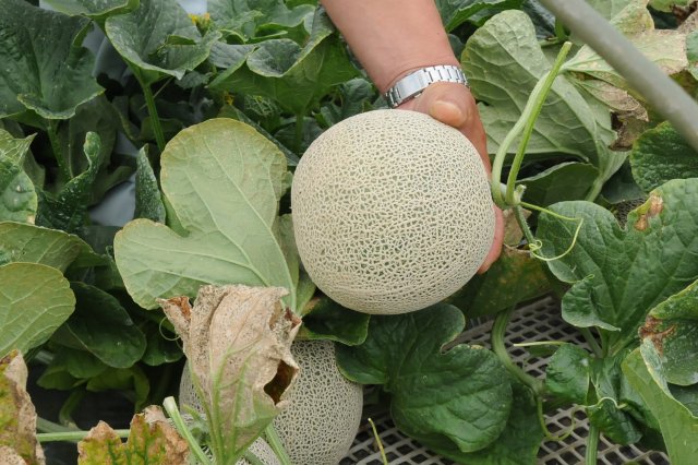 メロンは実を売る商売。良い実を育てるには、何より、“良い葉”を作ることが大事なのだそうです。 「葉と実の良さはだいたい比例してきますから。丈夫な樹が大根のようにしっかりとした根を張らせ、サトイモのように立派で大きな葉を付けることができれば、十中八九良いメロンになります。」その、“大きな葉”を作るには、たい肥と有機質肥料の分解速度を考え、与える時期とタイミングが大切なのだそうです。 また、もうひとつの長洲さんのこだわりが、収穫時期。 「葉の先がカリカリになってくると、メロンが熟し始めた証。それから4~5日収穫を我慢すると、今度は葉がチリチリになってきます。そこでメロンのお尻を見ます。おしりが少しヒビ割れて、実がパンパンになったところでやっと収穫します。メロンは収穫後、置けば果肉が追熟し柔らかくなります。しかし糖度は収穫してしまったらそれ以上は上がらない。柔らかくなると人間の舌の感覚で甘くなったように感じるのですが、実際糖度は収穫した時に止まってしまうんです。やっぱり甘いメロンを食べて欲しいですからね。限界まで糖度を上げることにこだわっています。」