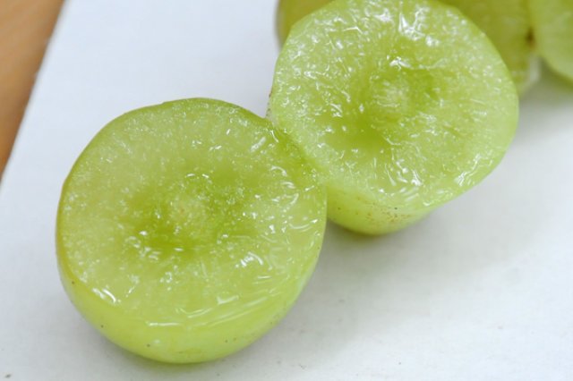 2010年頃から、六国アクツぶどう園では、巨峰系の生産をやめ、全て欧州系ぶどうに切り替えました。現在では、約50種類のぶどうに加え、新品種の育成も常に行っています。 皮ごと食べられるぶどうも少しずつ知られるようになり、リピーターも増えていきました。 「大きさよりも実が詰まったぶどう作りを目指しています。粒の大きなぶどうは、贈答用などでは大変喜ばれると思いますが、たくさんの種類のぶどうを少しずつ食べてもらえるよう、私はあえて“家族用のぶどう”として、小さく作っています。」 圷さんの作ったぶどうは、とてもジューシーなのに、実をカットすると果汁がこぼれない不思議なぶどうです。また、ぶどうを落としても割れずにボールのように弾みます。 圷さん曰く、「これこそが実が詰まっている証」なのだとか。