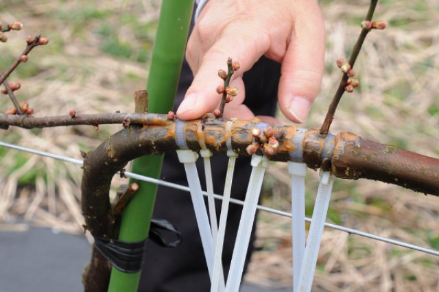 根本さんは、昭和10年創業の『根本漬物店』を営みながら、父の代からの『梅の生産』を行っています。『水戸の梅産地づくり事業』への挑戦を決めると同時に、それまでほ場に植えていた梅の木を全て伐採し、梅のジョイント栽培への準備を整えたそうです。 「うちにあった木は、父の代から育ててきた木なので樹齢60年前後のものがほとんどでした。樹の元気もなく、梅の収穫量も減っていたため、せっかく新しいことを始めるので、全ての木を入れ換えようと決めました。」と根本さんは語ります。 梅のジョイント栽培は、長く伸ばした梅の苗木を直線上に植え、地上60センチ程度の高さで隣の苗木と接ぎ木し、一列につなげて育てていく栽培方法で、これまで本格収穫まで10年近くを必要とした梅の育成期間を半減できるという画期的な方法です。 「ジョイント栽培を開発した神奈川県に視察に行き、素晴らしい技術に感銘を受けて、自分も取り入れようと決めました。一番の決め手は、作業が減ることです。梅の木は高い物で3メートルを超え、収穫や虫の防除には危険が伴います。しかしジョイント栽培の場合、樹の高さは約2メートルほどなので女性でも収穫ができます。また、それまで高い木ゆえに虫の防除もピンポイントにできず資材を無駄にしていたことも多かったのですが、そういったロスも防げます。」 これまで行ってきた梅の栽培は、熟練の剪定技術が必要でしたが、「ジョイント栽培は樹形が単純で難しい剪定作業がないので、初心者でも梅を育てることができるのも利点だ」と根本さんは言います。