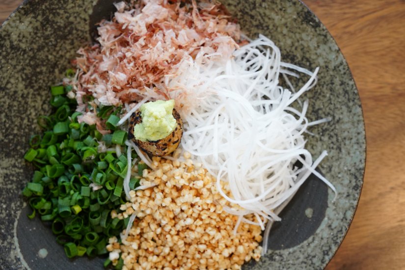 【ぶっかけせいろ】おそばの上に、大根の千切り・鰹節・青ねぎ・揚げたそばの実など豊富な薬味があしらわれており、その風味をお楽しみください。トッピングの焼みそが食感のアクセントに。