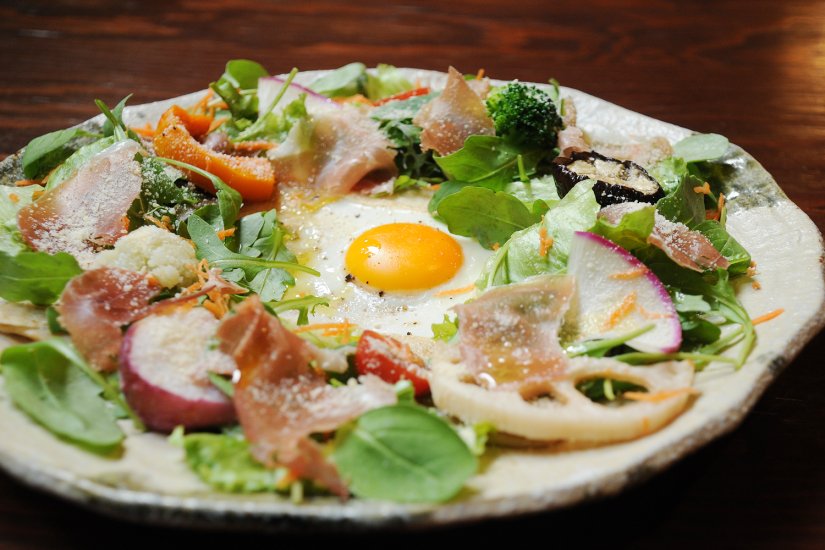 有機野菜を中心とした季節のお野菜がたっぷりのったガレットです。スモークサーモンか生ハムを選べます。