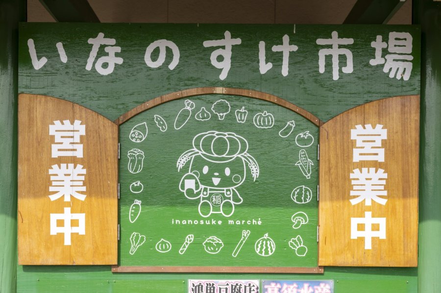 「いなのすけ市場」は、稲敷市の生産物直売施設としてオープンして以来、稲敷市内を中心に近隣の生産者の農産物や加工品を取り揃えています。店名にもなっている稲敷市のマスコットキャラクター「稲敷いなのすけ」の看板が目印です。