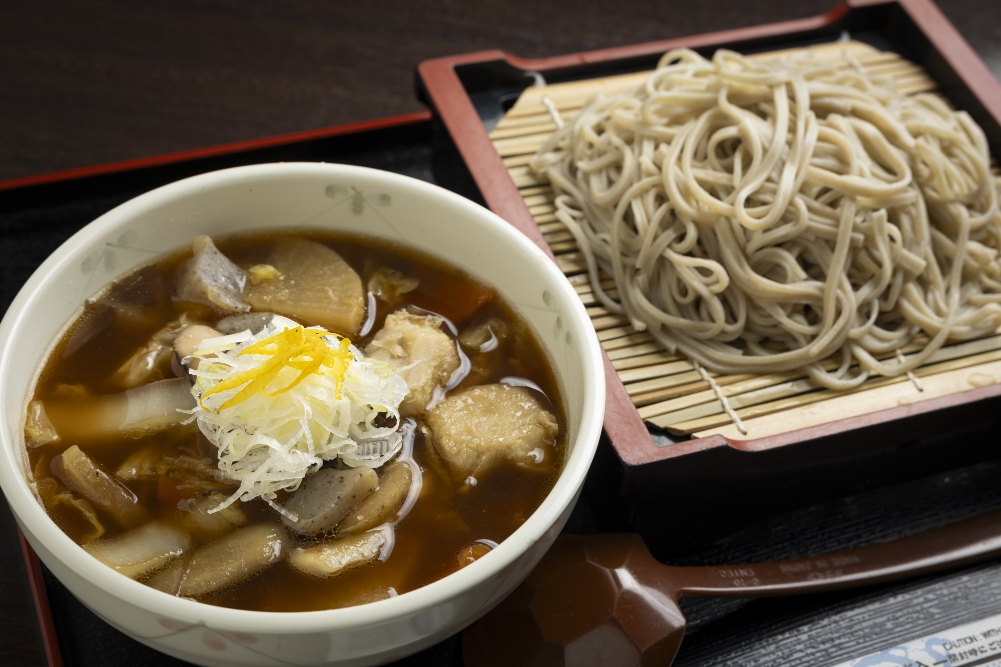 そしてもう一つは、常陸秋そばの故郷で味わう地元の味「つけけんちん蕎麦」、茹で前で160gのボリュームで食べ応えも十分です。このけんちん蕎麦は、常陸太田と言えば「つけけんちん」と言われるほどのソールフード。白菜、里芋、人参、ごほうなどの野菜を炒めながら味噌を絡め、醤油ベースのちょっと濃い目の味に仕上げる田舎仕立てがたまらない美味しさ。芋がらは決して忘れてはいけない食材です。