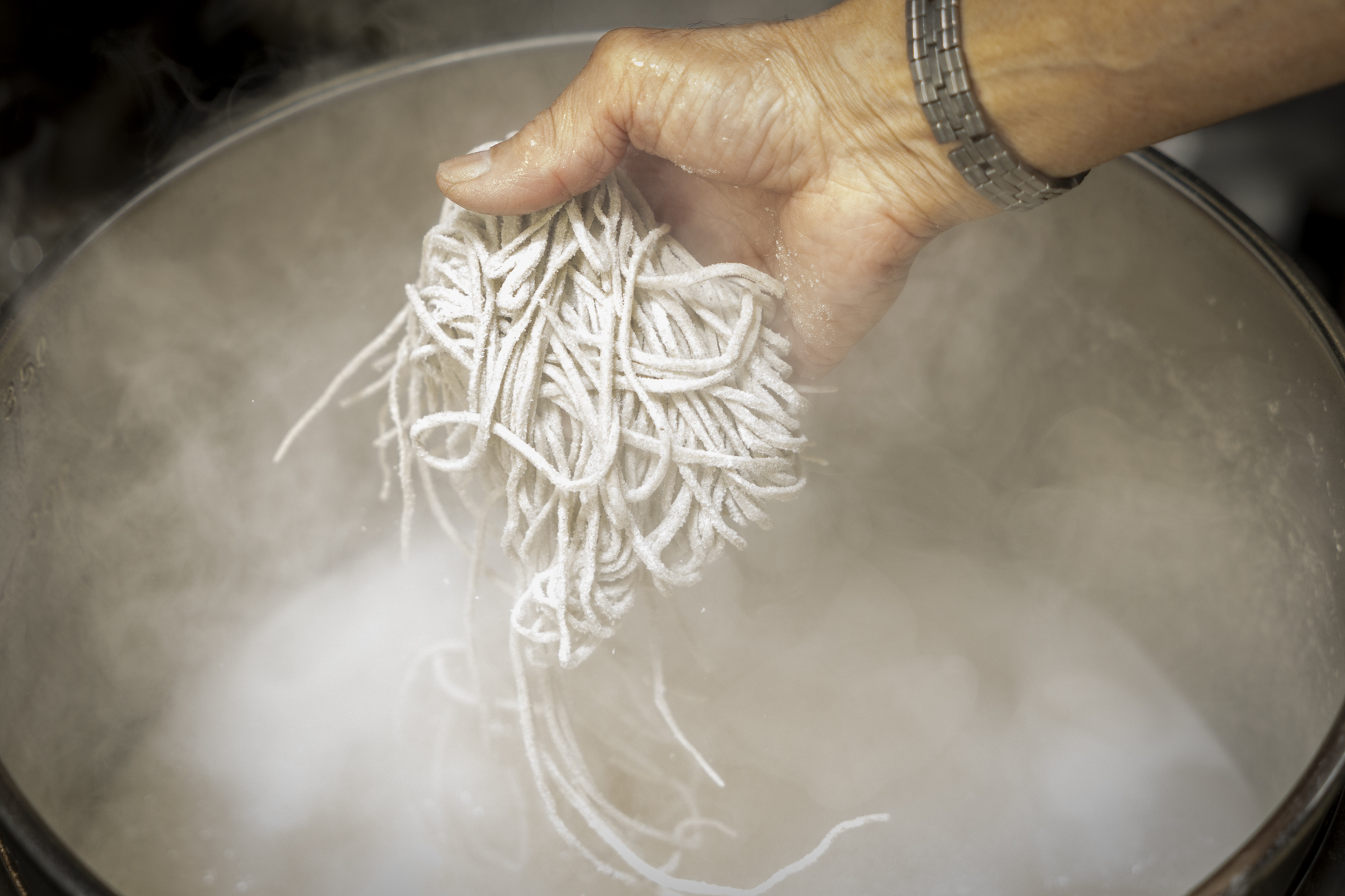 主の会沢二郎さんは脱サラ後、独学で蕎麦打ちをはじめました。その蕎麦打ちは基本に忠実でありながらも、既成概念にとらわれない探求心により、常に進化中。同店の蕎麦を食べたお客さんは口を揃えて「十割そばでこんなに滑らかなお蕎麦をはじめて食べた」と賞賛しています。その日打つ分だけ玄蕎麦を挽き、そして粉の粒を揃えてからしっかり練る。のしも切りも基本に忠実に!しかし、その工程の中で空気を抜く特別な作業をすることで、従来では考えられないような、しっかりとつながった手打ち蕎麦ができあがります。十割ならではの香りと旨味が秀でたそばでありながら、抜群のつながりで、喉を打つ食感もたまりません。