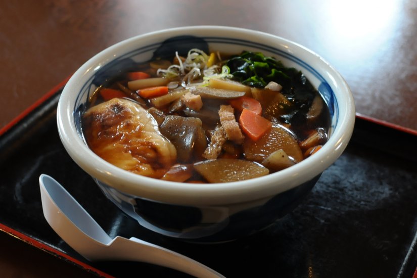 けんちんの中には、たくさんの野菜とお餅とわかめも入っています。栄養バランスもよく腹もちもよい人気メニューです。