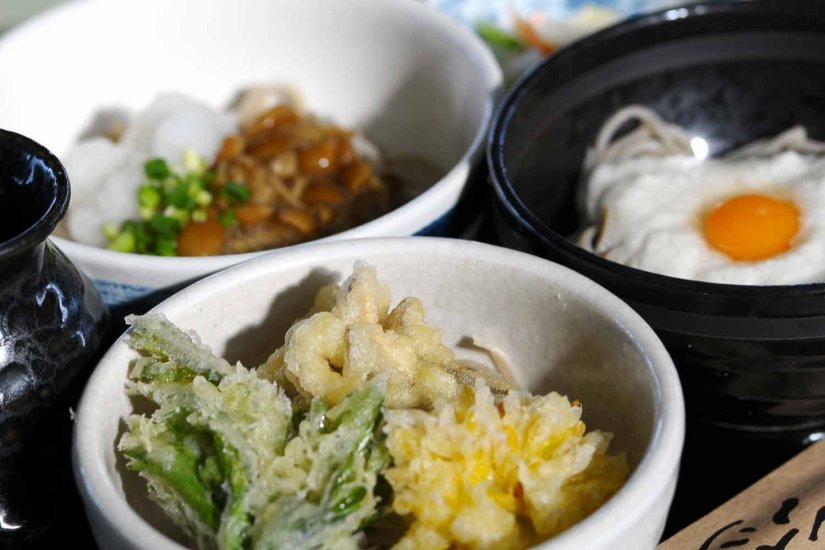 とろろ・なめこ・天ぷらの三種類の小丼ぶり