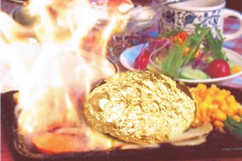 大人気の炎のハンバーグに、金粉をまとわせました。お祝いごとや記念日にご好評いただいでおります。