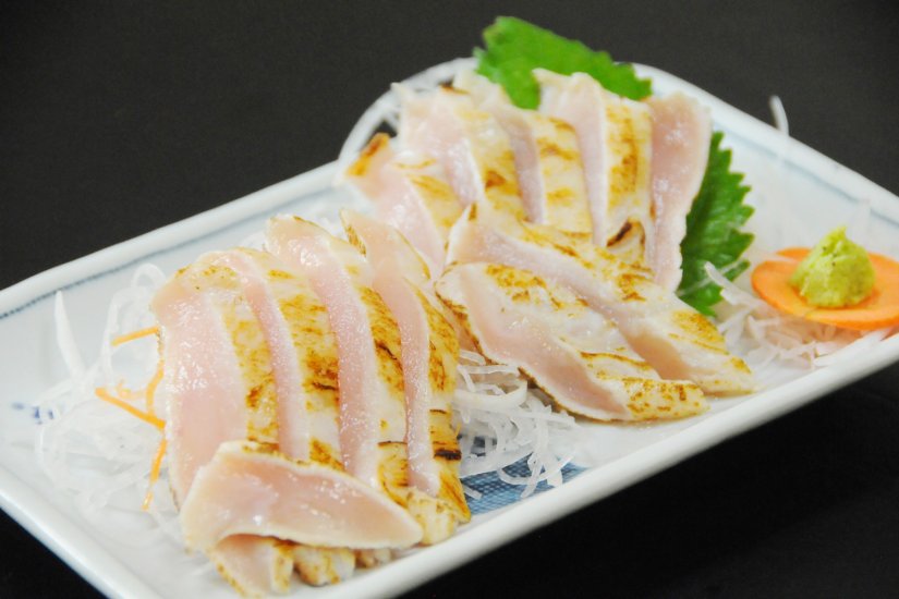 奥久慈しゃも一羽から2個しかとれない、生の上胸肉を使用した奥久慈しゃものタタキです。わさび醤油で、お刺身のような感覚で食べることができます。
