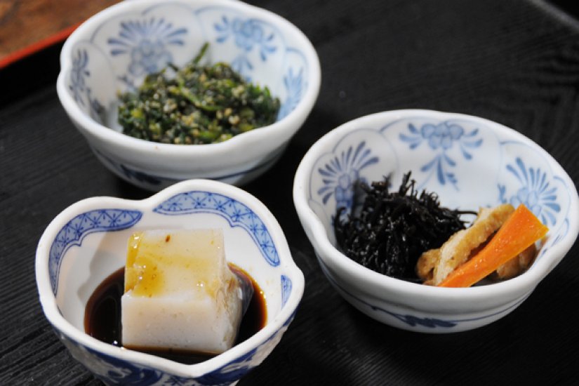 セットメニューには、嬉しい3種の小鉢が。一口サイズのそばがきの蜜かけが人気です。