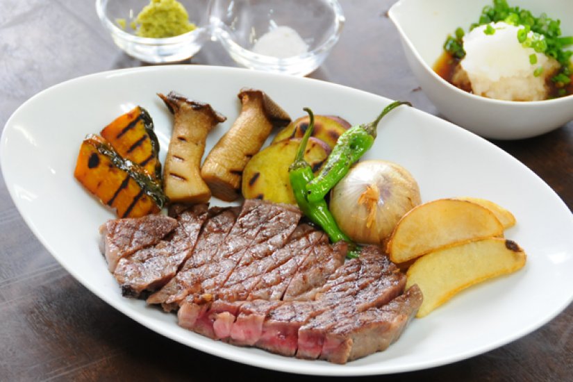 常陸牛を自家製ジャポネソースと一緒にいただきます。付け合わせの野菜も豊富で嬉しいセット。
