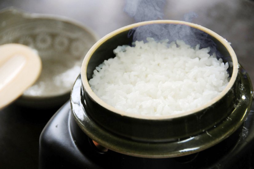 米が自慢のはるみ。お好きな単品料理に+500円(税別)で、土釜で炊いた米と、みそ汁、お漬け物が付きます。