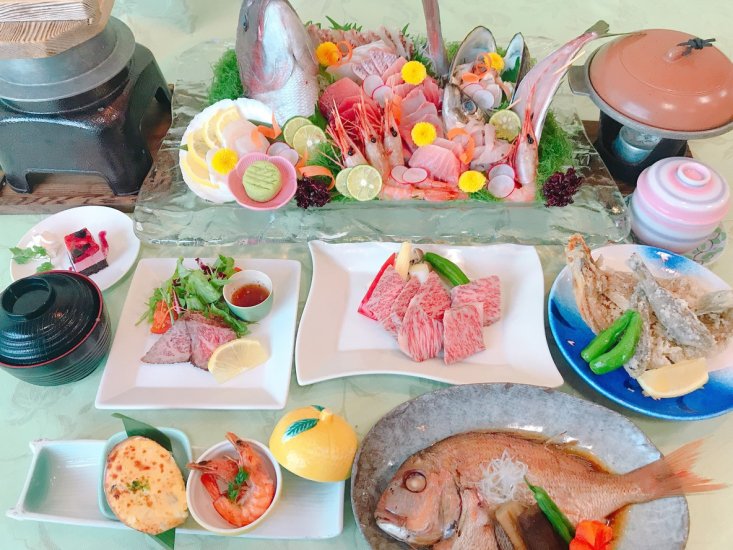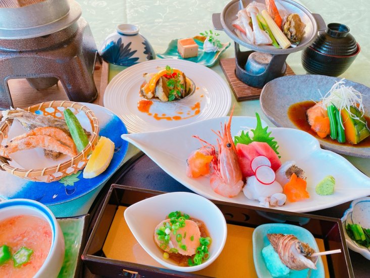 季節の豪華海鮮陶板焼き、あわびソテー、地魚唐揚げと海鮮磯料理