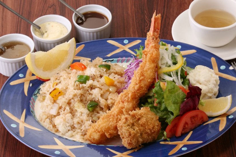 デフォルトで500gもあるというピリ辛ピラフ「あかねライス」。ピラフを1kgにして、スープや巨大海老フライまで全てを15分以内に完食すると無料というチャレンジメニューも行っています。
