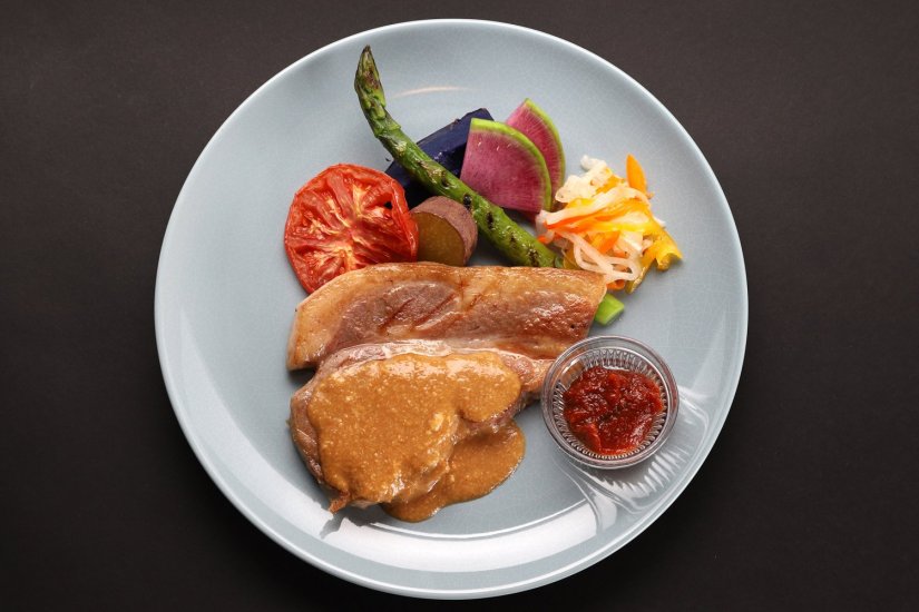 「ローズポーク」を常陸太田市の岡部酒造の酒粕と味噌を使用した独自のタレに漬け込み焼き上げます。