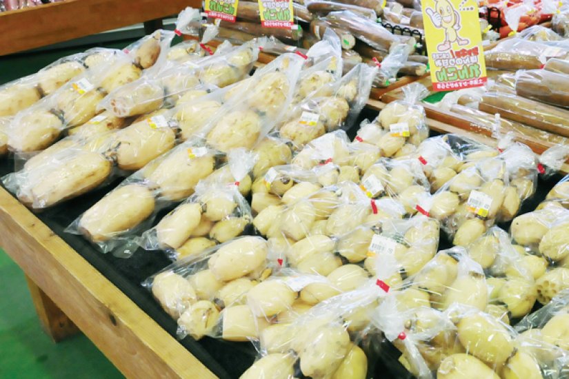 広いかすみがうら市の南側では特産のレンコン・梨。北側では柿や栗の産地となっており、店内には地場の恵みが並びます。