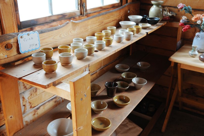 直売所奥に併設されている工房には、店主がご趣味で作っている焼き物と、奥様が作っている小物の展示販売もおこなっています。