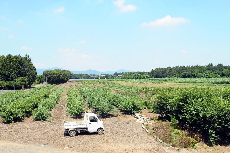広大なブルーベリー農園とログハウス、遠方には筑波山や愛宕山が望め、景色は最高です。