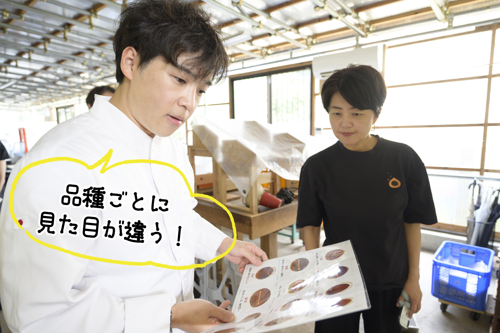 また、シェフは品種にも着目。「玉造の他には、どんな種類の栗があるんですか?」と質問するシェフに、よくぞ聞いてくれましたと西野さん。「栗には食べられるものとそうでないものがありますが、食べられるものだと20種類ぐらいあります。愛樹マロンでは、丹沢やぽろたん、筑波、石鎚(いしづち)などを栽培していますね。玉造の次は丹沢のシーズンです」と話す西野さんにシェフは「丹沢は僕も大好きでよく使っています!美味しい栗です」と頷いていました。