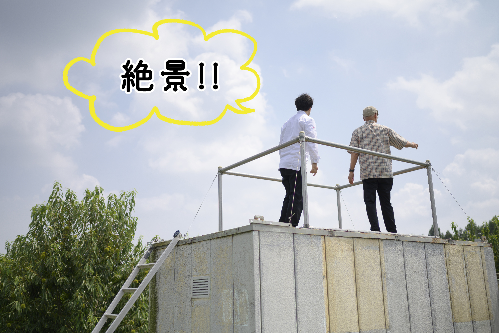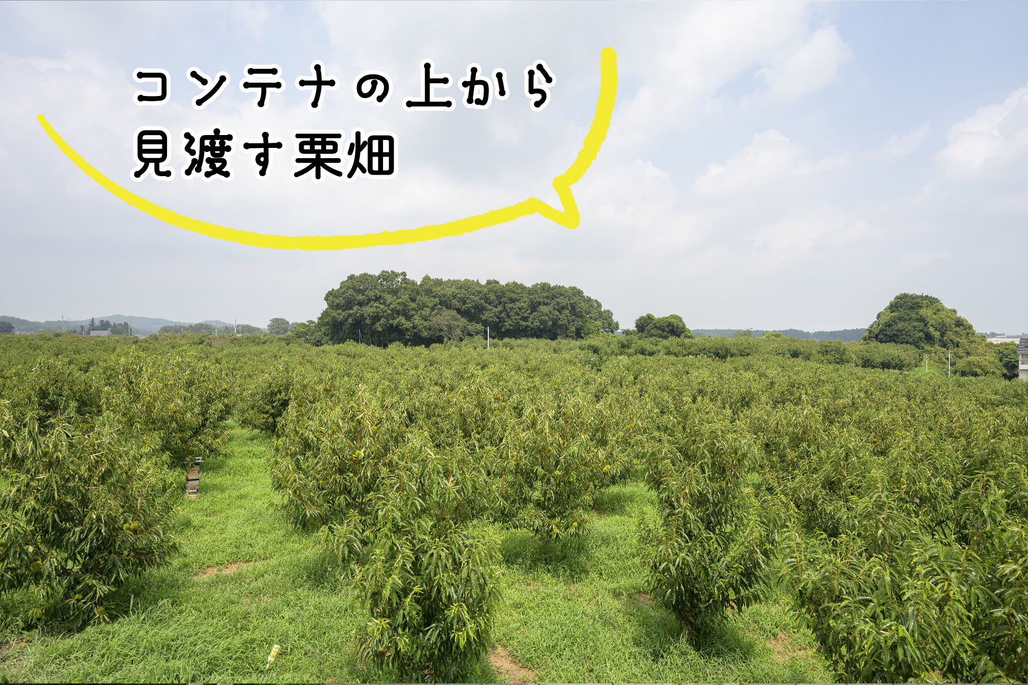 据え付けられたコンテナの上からの景色がオススメと繁實さんに聞いてすぐに上がっていったシェフは「すごい!良い景色!こんなに栗が植わっているところはあまり見られないですね」と喜んでいました。