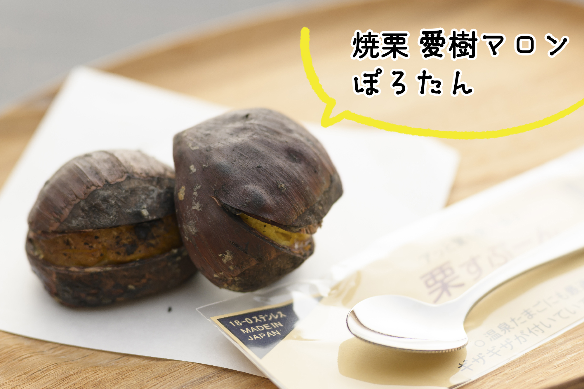 栗畑からショップに戻ると、西野さんからサプライズで「ぜひシェフに食べていただいて、感想を教えてもらいたいです!」と試食をご用意いただきました。まずいただいたのは、ぽろたんの焼栗。昨年の冷凍保存分を特別にお出しいただきました。今年の新物は10月10日ごろより、店舗限定で販売される予定です。