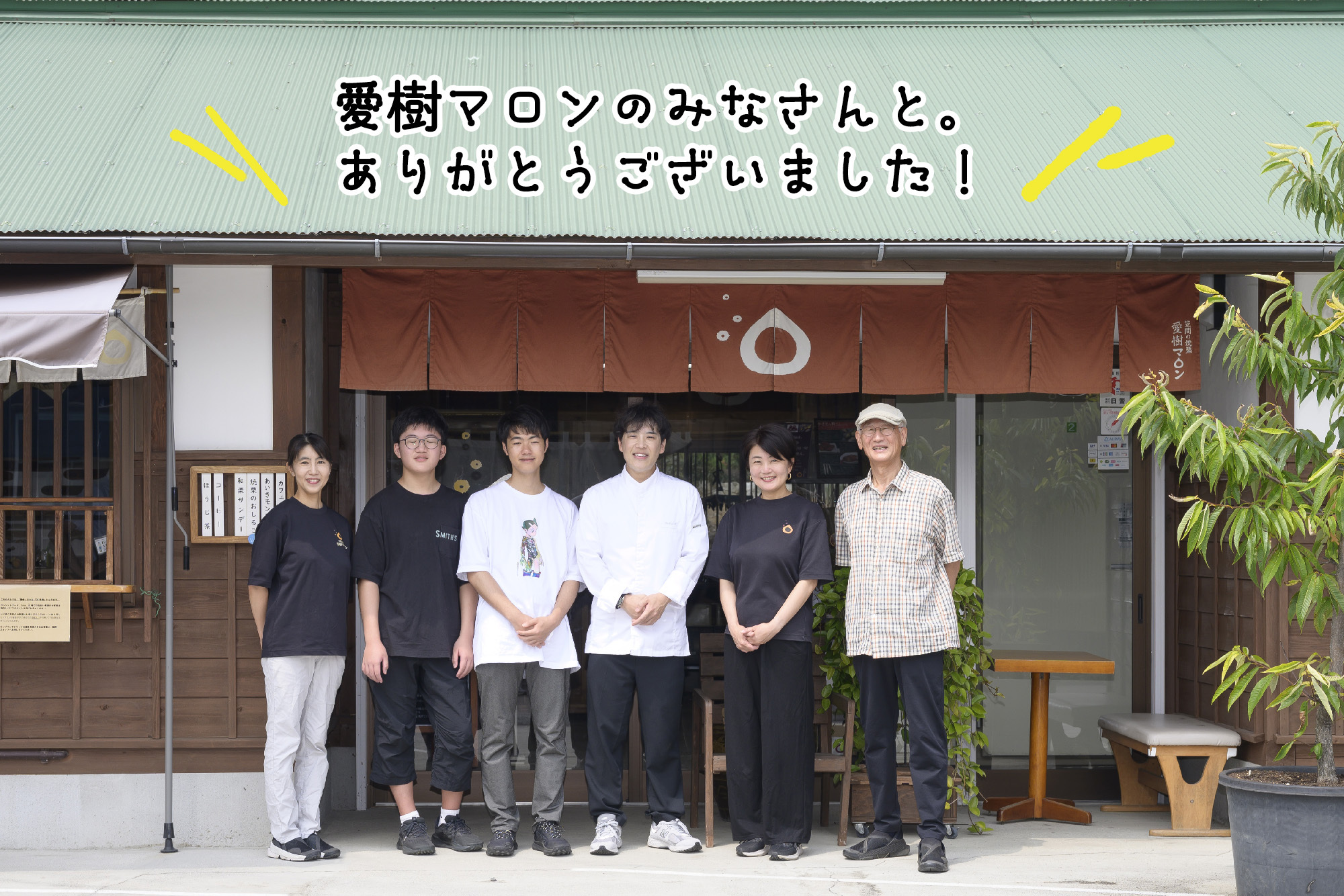 愛樹マロンに到着すると、迎えてくれたのは、店主の西野歩さんはじめご家族の皆さま。実は皆さま、ファビオシェフのYouTubeチャンネルをご覧になっていただいているそうで、「いつも動画で見ているシェフが来てくれるなんて、とっても楽しみにしていました!」と大歓迎です。
