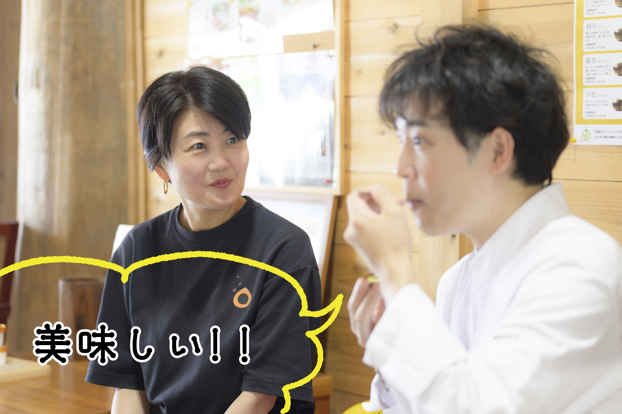 中でもシェフが気になっていた様子だったのは、「大粒栗のほくほくカレー」。繁實さんのアイデアで、ジャガイモの代わりに熟成栗を入れてみたのだそう。「意外な組み合わせと思いましたが、スパイスの辛みの中に栗の甘みと旨みが加わったら美味しそうですね」とシェフも納得のコンビネーションです。